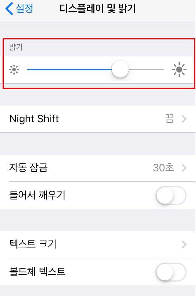 여기에 보면 자동밝기자동 밝기 부분이 있습니다. 이 자동 밝기는 어두운 곳에 갈 때에는 화면의 밝기가 자동으로 밝아지고 밝은 곳에 있을 때 적절하게 밝기가 조절되는 자동기능인데요. 이 부분을 끔 상태로 해줍니다. 그러면 자동으로 밝기 조절 기능이 상실이 되면서 처음에 했던 디스플레이 밝기 조절 상태 그대로 환경에 상관없이 계속 지속되게 되는 것이지요. 그래서 아이폰 화면 어두워짐 현상을 막을 수 있습니다. 또 하나의 방법이 있는데요.
