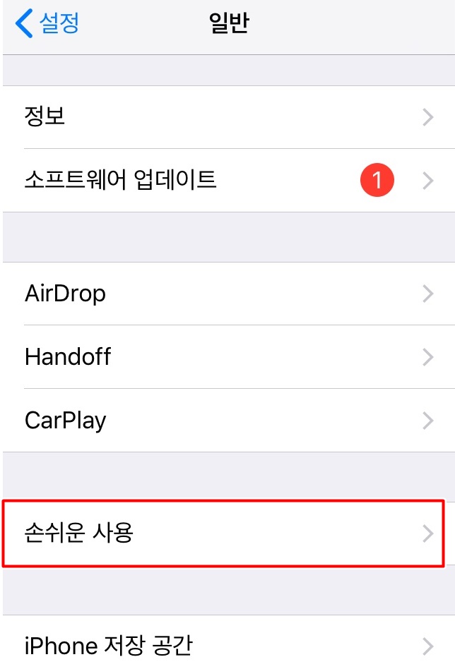 설정- 일반으로 들어가면 '손쉬운 사용'이라는 부분이 있습니다. 여기를 터치해 줍니다.